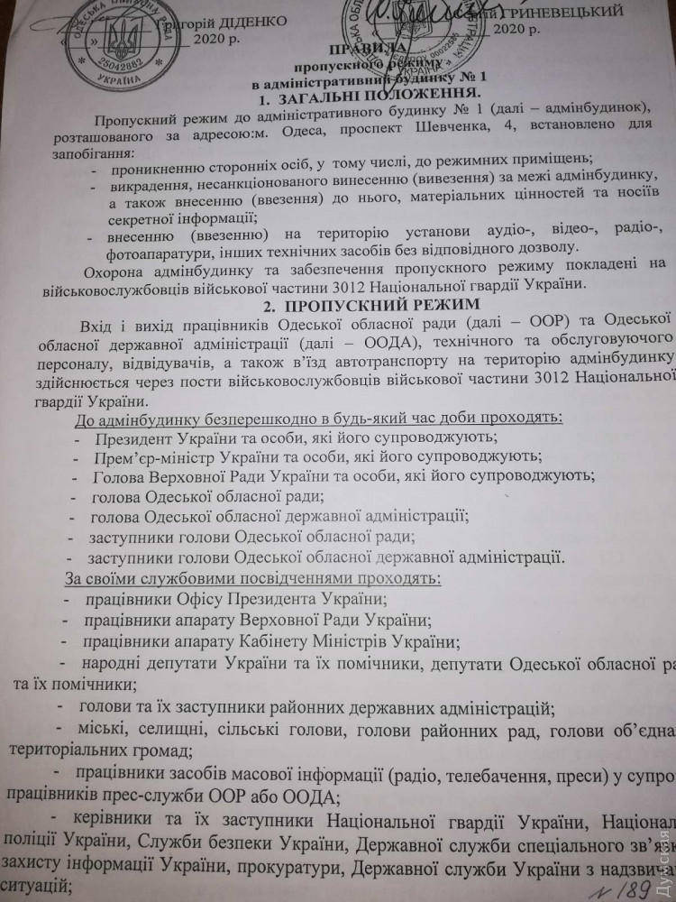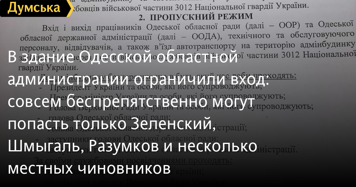 Также внутрь здания разрешено заходить работникам Офиса президента, аппарата ВР, Кабмина, народным депутатам и их помощникам, депутатам Одесского облсовета и их помощникам, главам райадминистраций или их замам, мэрам городов, главам поселковых и сельских советов, начальнику областной полиции, УСБУ, ГСЧС, Госслужбы спецсвязи, других силовых структур. Правда, в отличие от Зеленского, Шмыгаля и Разумкова, им придется предъявить свои удостоверения (очевидно, предполагается, что руководителей государства нацгвардейцы, охраняющие здание, должны знать в лицо).