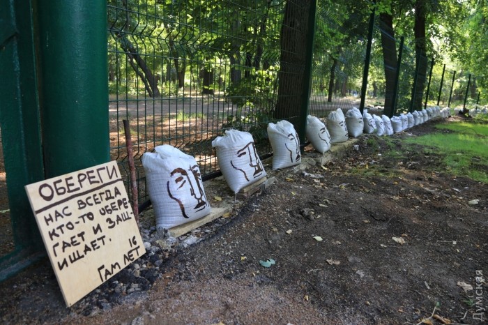 Харьковский художник Гамлет Зиньковский использовал для создания своего объекта около полусотни мешков с песком, на которых изображены лица. Мишки выстроены возле ограждения и, по словам автора, символизируют серую массу человечества.