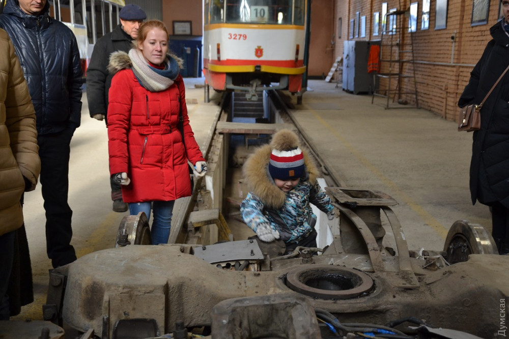 Сегодня у сотрудников ВРМ был очередной волнительный день – по случаю празднования Дня местного самоуправления в расположенный здесь же музей истории одесского электротранспорта пришла обзорная экскурсия. И не как обычно, а с посещением рабочих боксов ВРМ. Это требует повышенного внимания со стороны персонала: юркие малыши норовят разбежаться по всем уголкам и щелям, залезть в ремонтирующиеся трамваи, испачкаться и пораниться. К счастью, детское внимание отвлекают коты и кошки, проживающие на территории, а также воробьи, которые греются в колесах, расположившихся на солнышке трамваев. Ну и конечно, «Одиссей», в кабине которого разрешают сидеть и даже позвонить в звонок.