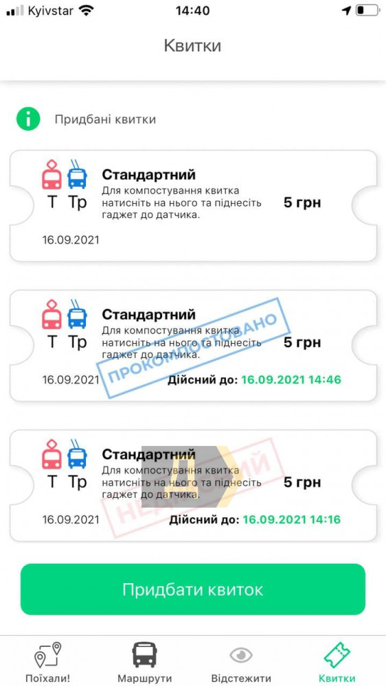 Купить билет через приложение Transpod не составляет труда, все интуитивно понятно — покупка совершается в два клика. Сейчас доступен только один вид билета, одноразовый. Стоимость пять гривен, комиссии пока нет. Билет действителен в течение суток, но после «компостирования» — всего час. Так что, не торопитесь подносить ваш смартфон к валидатору — к примеру, трамвай №27 от конечной до конечной в среднем идет больше часа, а девятый троллейбус легко может попасть в пробку, особенно в час пик. В общем, лучше расплатиться при выходе.