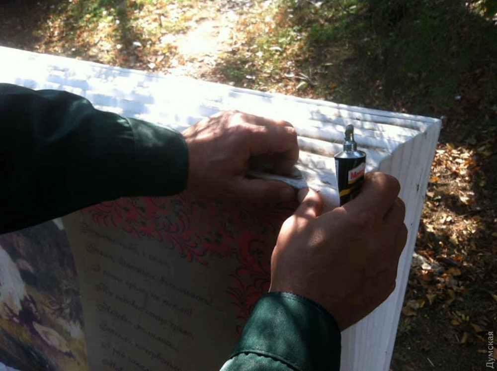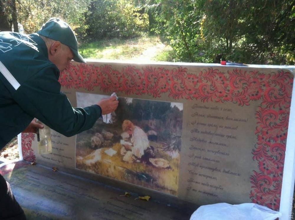 Как отметили в КП «Одесгорзелентрест», вандалы изрисовали краской портрет Кобзаря и сорвали защитную пленку со скамеек.