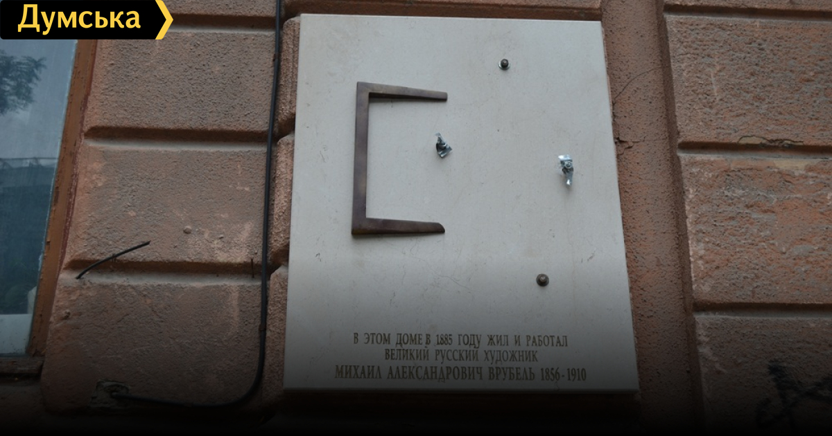 С фасада дома на Софиевской,18 исчезла основная часть мемориальной доски, посвященной известному живописцу конца ХІХ — начала ХХ века Михаилу Врубелю. Как передает ваш корреспондент, неизвестные злоумышленники сорвали со стены металлическую фигуру Врубеля. Теперь о ней напоминает только надпись, сообщающая, что в этом доме в 1885 году жил великий русский художник.