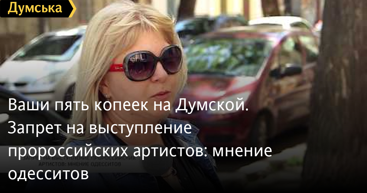 Ваши пять копеек на «Думской». Запрет на выступление пророссийских артистов: мнение одесситовСМЕРТЬ РОССИЙСКИМ ОККУПАНТАМ! Заметили ошибку? Выделяйте слова с ошибкой и нажимайте control-enter Думская ТВ. Ваши пять копеек на «Думской»: