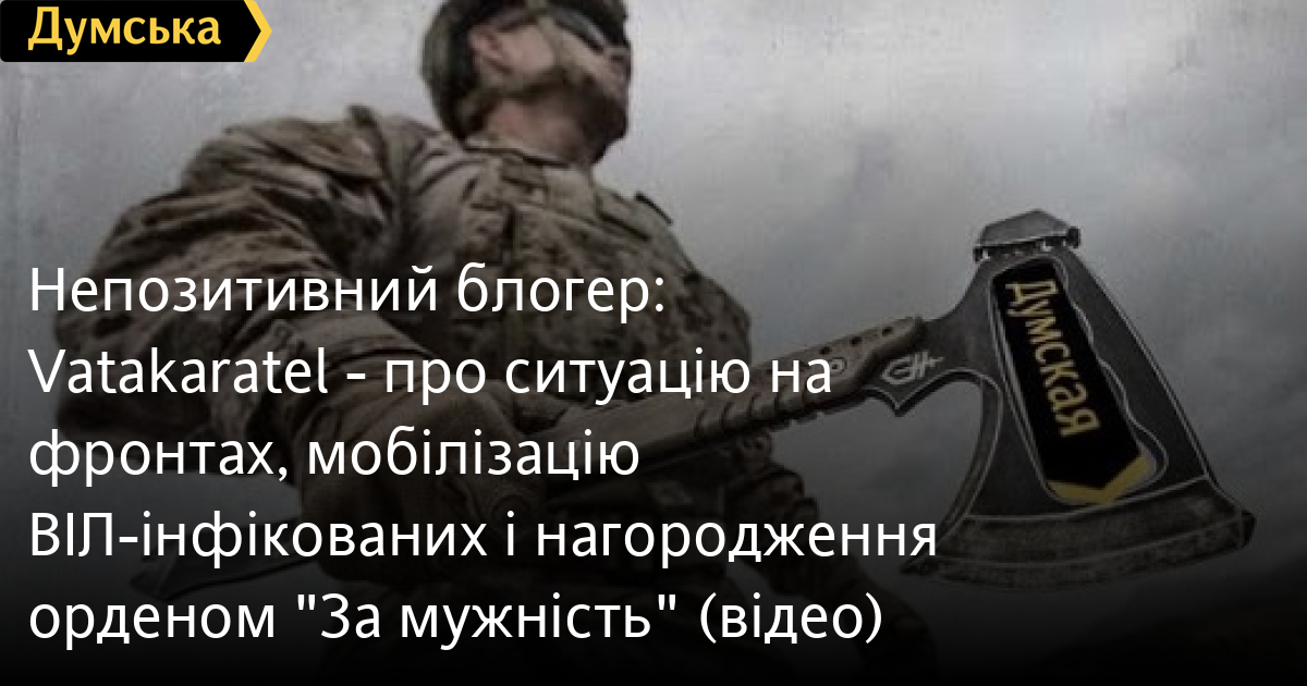 Непозитивний блогер: Vatakaratel — про ситуацію на фронтах, мобілізацію ВІЛ-інфікованих і нагородження орденом «За мужність» (відео)Добрий друг «Думської», захисник України, наш автор із ніком Vatakaratel Віталій Плахотнюк записав блог, у якому традиційно розповів про ситуацію на фронтах, а також привітав розвідників із їхнім професійним святом (7 вересня). Сам Vatakaratel раніше служив у 131 окремому розвідувальному батальйоні, тому вважає це свято своїм. З нагоди Дня військової розвідки України Віталія нагороджено орденом «За мужність» III ступеня. Також блогер прокоментував нещодавно ухвалені Верховною Радою поправки до закону про мобілізацію, що дозволяють призивати до лав Збройних сил ВІЛ-інфікованих громадян, а також людей із психічними розладами. Насамкінець Віталій показав запис своєї розмови з окупантом, якого взяли в полон розвідники 28 бригади. Підтримати підрозділ нашого друга фінансово: 4731219644609368, Плахотнюк Віталій Олексійович. СМЕРТЬ РОСІЙСЬКИМ ОКУПАНТАМ! Помітили помилку? Виділяйте слова з помилкою та натискайте control-enter Новини по цій темі: 6 серпня 2025: Зброя за всі гроші світу, провалена мобілізація і проблеми тилу: негативний блог (відео) 16 липня 2025: Російські КАБи не долітають до Одеси, а ворог готується форсувати Дніпро: непозитивний блог (відео) 12 березня 2025: «Ситуація стабільна і небезнадійна": Vatakaratel про те, що зараз відбувається на фронтах (відео) 4 лютого 2025: Vatakaratel про контузію на фронті, марні очікування від Трампа та переваги від призначення Драпатого (відео) |