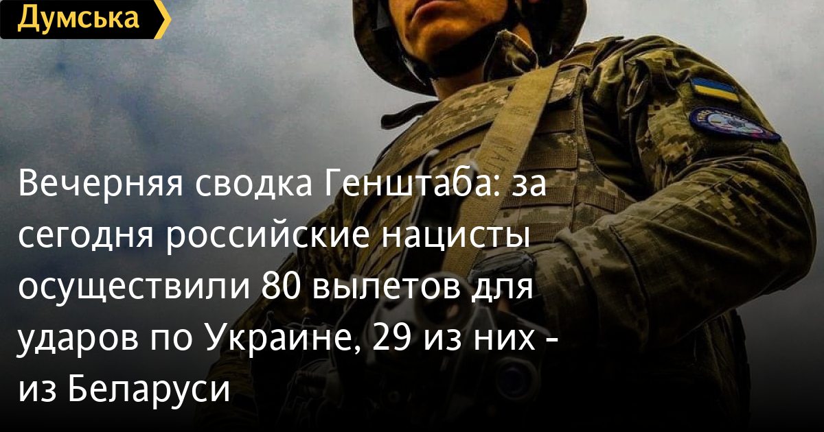 Не преуспевая, враг продолжает наносить ракетно-бомбовые удары с использованием средств воздушного нападения по объектам военной и гражданской инфраструктуры в Житомирской, Киевской, Черниговской, Харьковской и Донецкой областях. Противник совершил более 80 вылетов, в том числе 29 с аэродромов Барановичи и Бобруйск, расположенных на территории республики Беларусь.