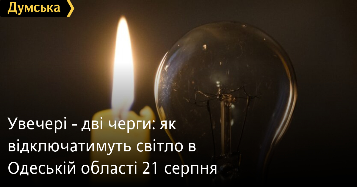 Увечері — дві черги: як відключатимуть світло в Одеській області 21 серпняСтабілізаційні графіки відключення електроенергії запроваджено на Одещині, як і по всій Україні, 21 серпня. Обмеження діятимуть з 16:00 до 24:00, повідомляє НЕК «Укренерго». З 18:00 до 22:00 без світла залишаться одночасно дві черги споживачів, з 16:00 до 18:00 і з 22:00 до 24:00 — одна черга. Об'єкти критичної інфраструктури відключати не будуть. Подивитися графіки можна в чат-ботах «ДТЕК Одеські електромережі» Viber і Telegram, а також на сайті. СМЕРТЬ РОСІЙСЬКИМ ОКУПАНТАМ! Помітили помилку? Виділяйте слова з помилкою та натискайте control-enter |
