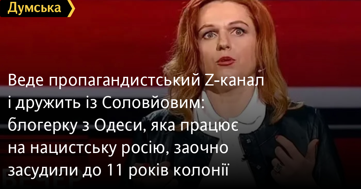 Веде пропагандистський Z-канал і дружить із Соловйовим: блогерку з Одеси, яка працює на нацистську росію, заочно засудили до 11 років колоніїВинною у колабораціоністській діяльності, виправданні, визнанні правомірною збройної агресії російської федерації проти України, а також глорифікації її учасників визнав Галицький районний суд Львова одеситку Юлію Вітязєву (Лозанову). Як повідомляє кореспондент «Думської», днями він заочно засудив її до 11 років позбавлення волі з конфіскацією майна. Крім того, після відбуття покарання жінка не зможе 15 років обіймати посади в органах державної влади та місцевого самоврядування. Юлія Вітязєва — відома блогерка і російський пропагандист. Народилася 25 червня 1981 року в Одесі. Закінчила Одеську національну юридичну академію. У 2015 році переїхала до росії, де почала працювати на інформаційну агенцію News Front, а згодом завдяки чоловікові стала співзасновницею цього ресурсу, який перебуває під санкціями Австралії, США, Нової Зеландії та Японії. Також веде телеграм-канал «FRONTовые Zаметки», у якому заохочує вбивства мирних громадян і закликає до геноциду українського народу. Регулярно бере участь у пропагандистському ток-шоу «Вечер с Соловьевым» на російському державному ТБ. Дружить із цим одіозним телеведучим. Чоловік Юлії — Михайло Синелін, заступник керівника секретаріату голови уряду рф Михайла Мішустіна. До цього був заступником голови правління «Внешэкономбанка», а також обіймав керівні посади в апараті уряду під керівництвом Михайла Фрадкова і Михайла Касьянова. СМЕРТЬ РОСІЙСЬКИМ ОКУПАНТАМ! Помітили помилку? Виділяйте слова з помилкою та натискайте control-enter |