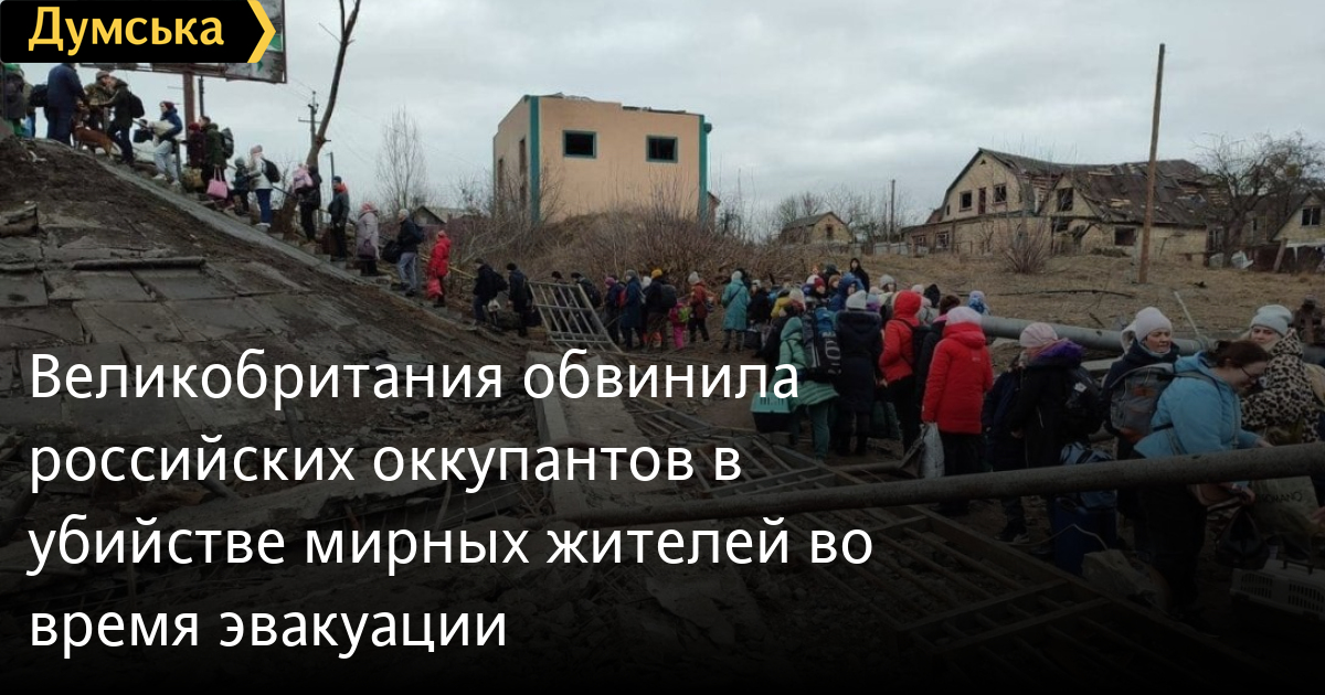 Министерство обороны Великобритании обвинило Россию в нанесении ударов по коридорам эвакуации и убийстве «нескольких мирных жителей», которые пытались эвакуироваться из города Ирпень Киевской области.