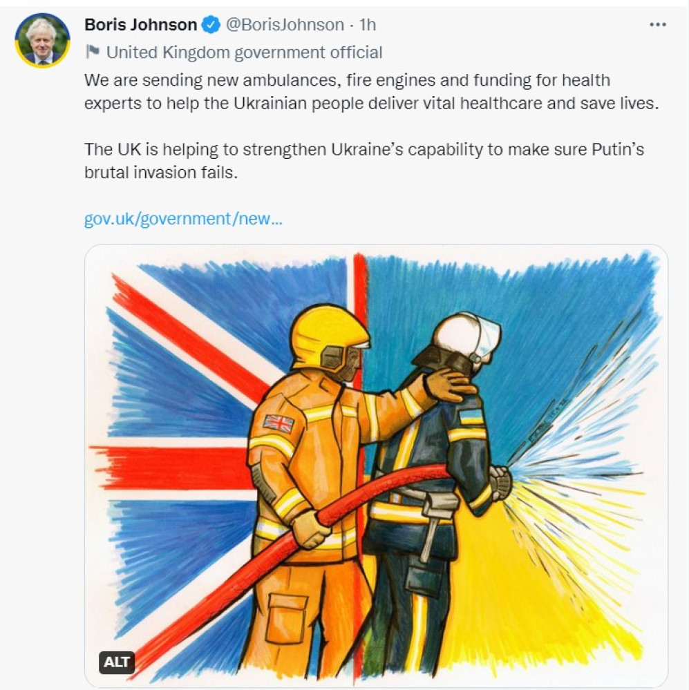 «Мы отправляем новые машины скорой помощи, пожарные машины и финансируем экспертов в области здравоохранения, чтобы помочь украинскому народу оказывать жизненно важную медицинскую помощь и спасать жизни.