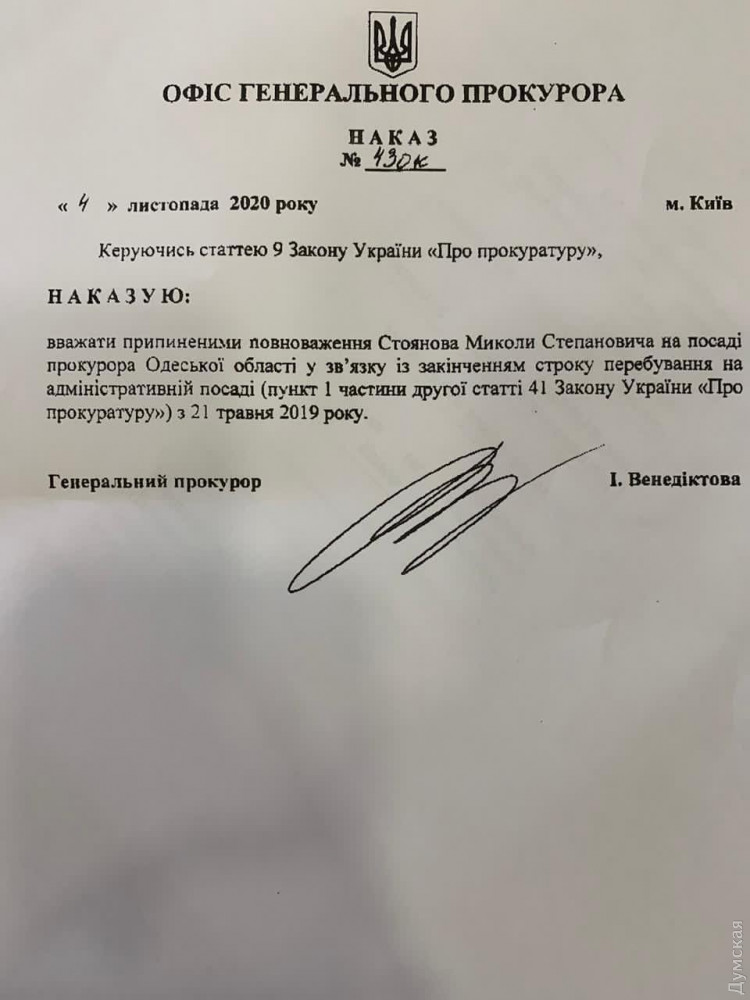 «Считать прекращенными полномочия Стоянова Николая Степановича на должности прокурора Одесской области в связи с завершением срока пребывания на административной должности с 21 мая 2019 года», — отмечается в приказе генпрокурора.