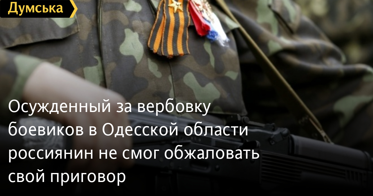 Напомним, приговор россиянину был вынесен 14 августа. Мужчину признали виновным в том, что он по заданию спецслужб своей страны занимался вербовкой наемников на курорте Каролино-Бугаз в Овидиопольском районе. Боевики должны были участвовать в боевых действиях на стороне так называемой «луганской народной республики». Один из завербованных, охотник, согласился воевать в качестве снайпера.