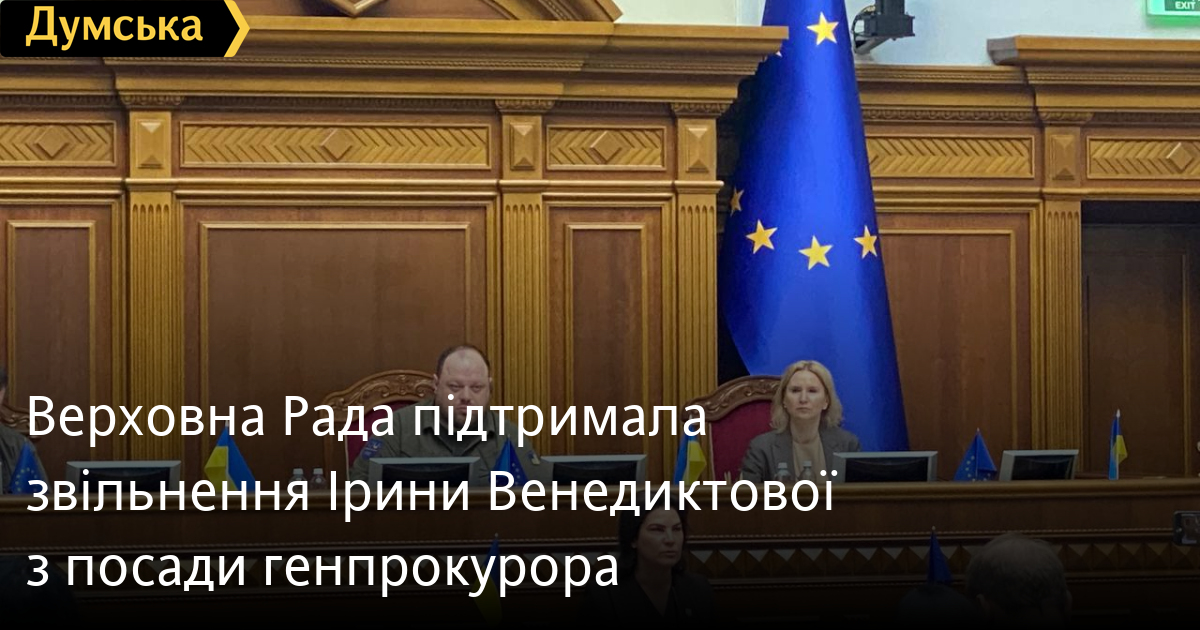 Верховна Рада підтримала звільнення Ірини Венедиктової з посади генпрокурораВерховна Рада України підтримала звільнення Ірини Венедиктової з посади очільниці Офісу генпрокурора. Як повідомив народний депутат Ярослав Железняк, вона була присутня на засіданні. Звільнення супроводжувалося обговоренням без гучних заяв та звинувачень. За звільнення Венедиктової проголосували 264 нардепа. По фракціях: «Слуга народу» — 198 голосів; Зазначимо, два дні тому президент України Володимир Зеленський відсторонив Ірину Венедиктову з посади генпрокурора. В. о. генпрокурора став заступник Венедиктової — Олексій Симоненко. Помітили помилку? Виділяйте слова з помилкою та натискайте control-enter |