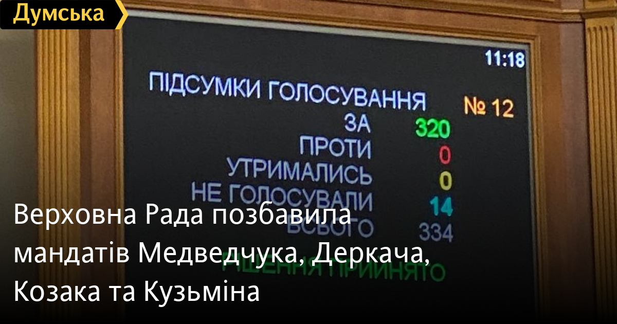 Верховна Рада позбавила мандатів Медведчука, Деркача, Козака та КузьмінаВерховна Рада достроково припинила повноваження народних депутатів Віктора Медведчука, Андрія Деркача, Тараса Козака та Рената Кузьміна. Про це повідомив народний депутат Ярослав Желєзняк. «Рада позбавила мандатів через втрату громадянства Віктора Медведчука — 320 (голосів — Ред.) «за», Тараса Козака — 317 «за», Андрія Деркача — 314 «за», Ріната Кузьміна — 319 «за», — розповів Железняк. Крім того, припинено повноваження народного депутата Андрія Аксьонова, який раніше написав заяву про складання мандату. Нагадаємо, президент України Володимир Зеленський 10 січня позбавив громадянства депутатів від колишньої партії ОПЗЖ Медведчука, Козака та Кузьміна, а також позафракційного Деркача. Усі четверо звинувачуються у державній зраді. Помітили помилку? Виділяйте слова з помилкою та натискайте control-enter |