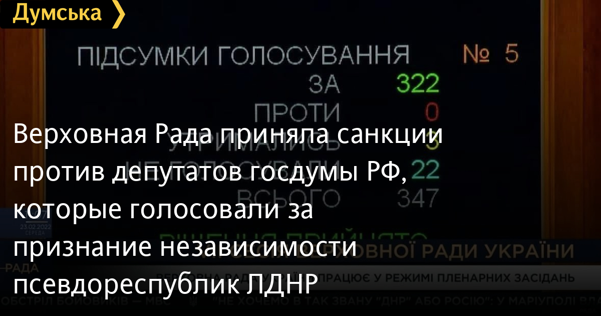 Народные депутаты Украины большинством голосов приняли постановление о введении санкций в отношении 351 гражданина РФ – депутатов госдумы, которые 15 февраля поддержали обращение к Путину с просьбой о признании «независимости» марионеточных псевдореспублик «ЛНР» и «ДНР».
