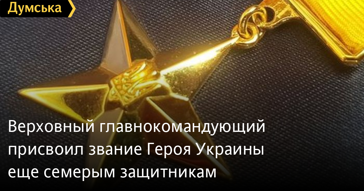 Верховный главнокомандующий присвоил звание Героя Украины еще семерым защитникамЗвание Героя Украины с вручением ордена «Золотая Звезда» присвоил Президент Украины, Верховный главнокомандующий Владимир Зеленский семерым украинским воинам. Соответствующий указ он подписал вчера. К сожалению, пятеро защитников стали Героями посмертно: - Апухтин Дмитрий Александрович — полковник; - Амелин Артем Андреевич — старший солдат; - Партали Станислав Юрьевич — лейтенант; - Тымченко Александр Александрович — младший сержант; - Чуприн Михаил Русланович — старший лейтенант. Также высшая степень отличия присвоена: - Громадскому Евгению Олеговичу — лейтенанту; - Жумабоеву Мукимбою Юнусовичу — полковнику. СМЕРТЬ РОСІЙСЬКИМ ОКУПАНТАМ! Помітили помилку? Виділяйте слова з помилкою та натискайте control-enter |