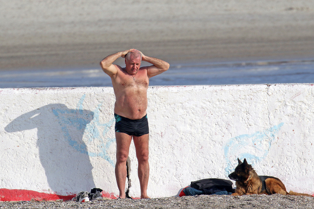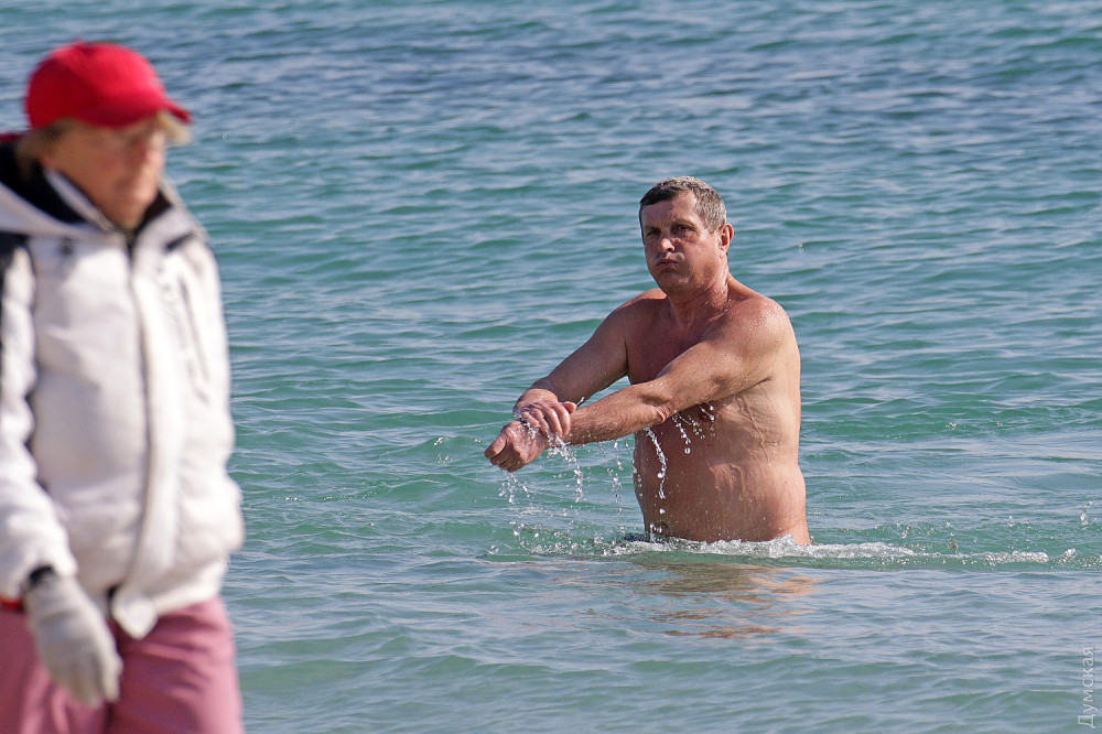 Теплый солнечный день выгнал к морю сотни гуляющих. По словам моржей, температура воды примерно 7 градусов, что довольно редко для этого времени года.