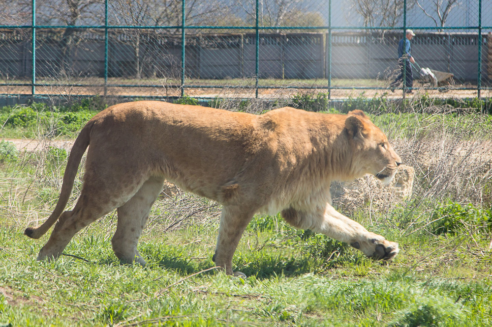Сначала заглянули к копытным и страусам, пасущимся на открытой территории, а потом — к хищникам. Сегодня нашим гидом согласилась побыть заместитель директора Яна Суровцева. Хрупкая миловидная девушка увлеченно рассказывает о своих подопечных. Каждого из них она знает по имени. Храбрости Яны позавидуют многие маститые дрессировщики, она собственноручно загоняет львов на ночь в вольеры и заходит к ним в клетку.