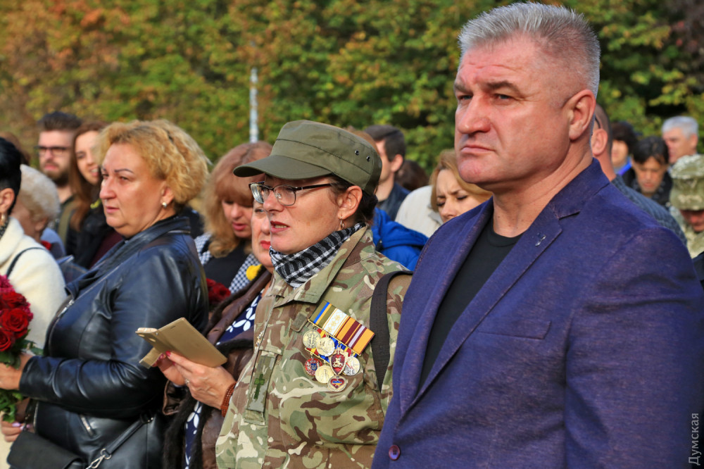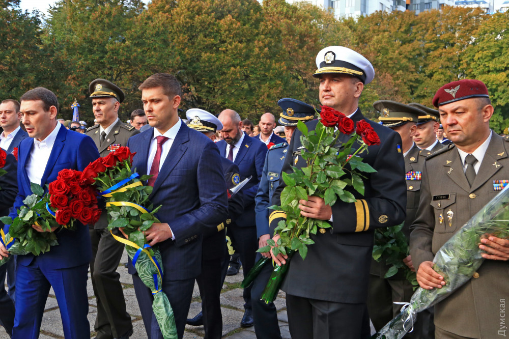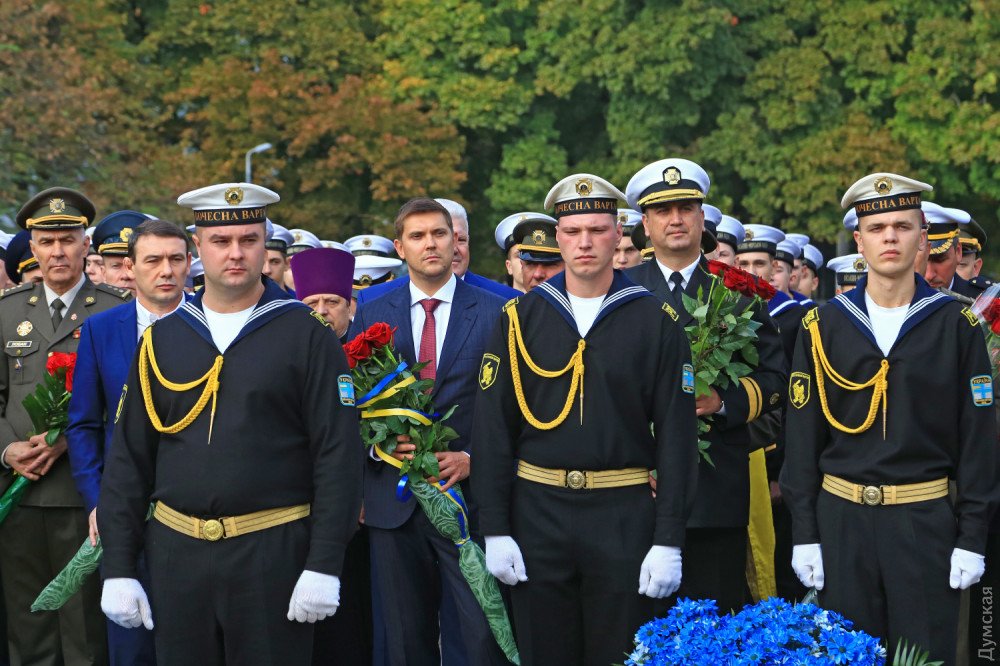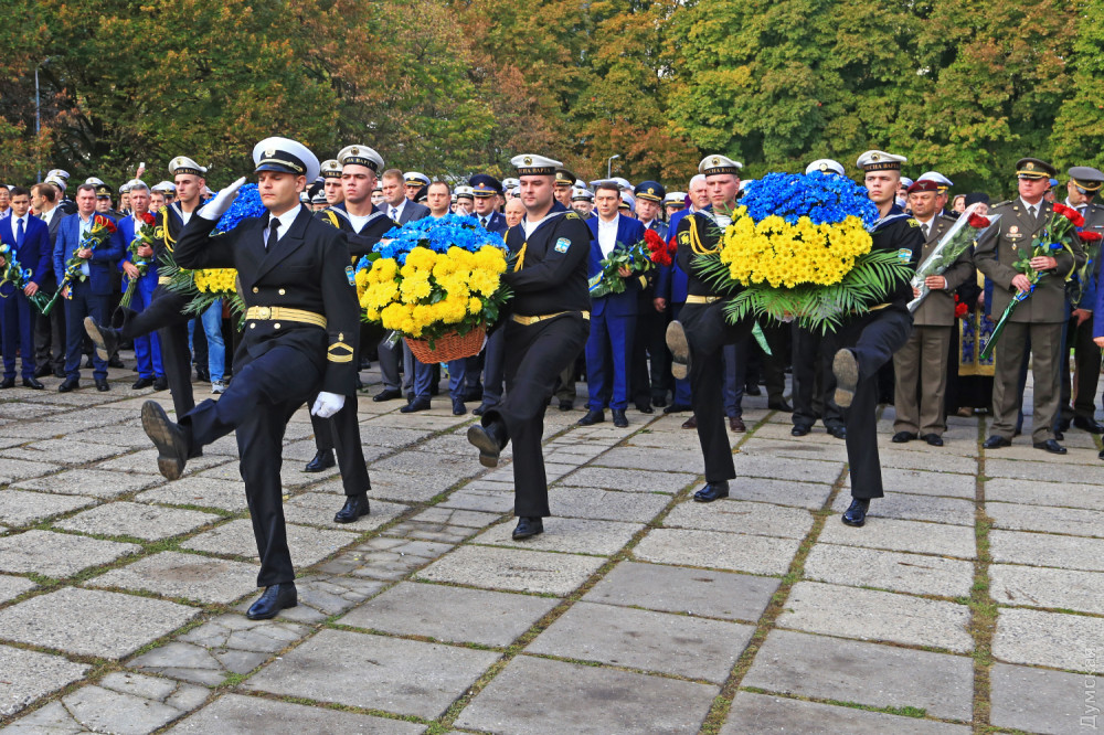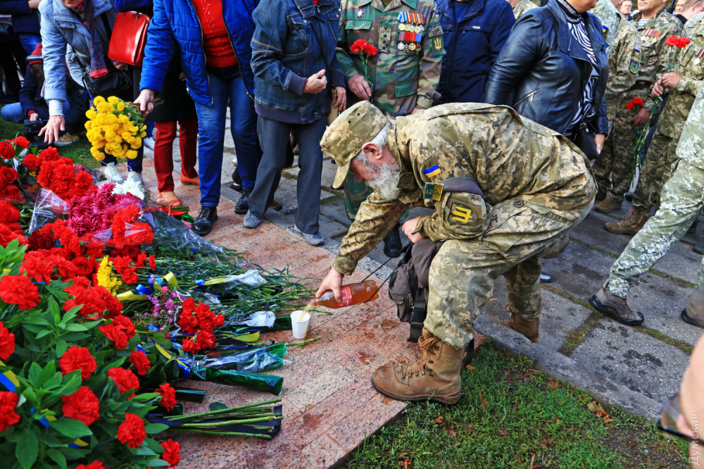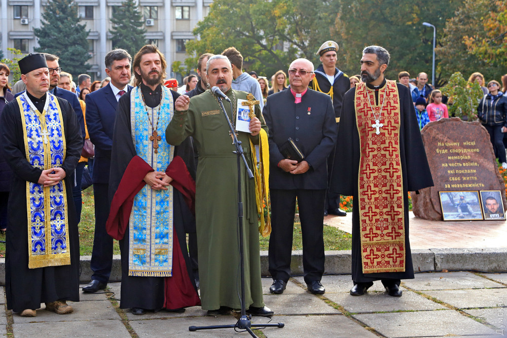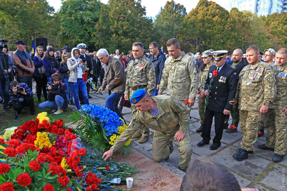 Официальные лица и простые одесситы возложили цветы у камня, на месте которого возведут когда-то памятник павшим. После это состоялся молебен всех конфессий за Украину. Собравшиеся почтили память украинских героев.