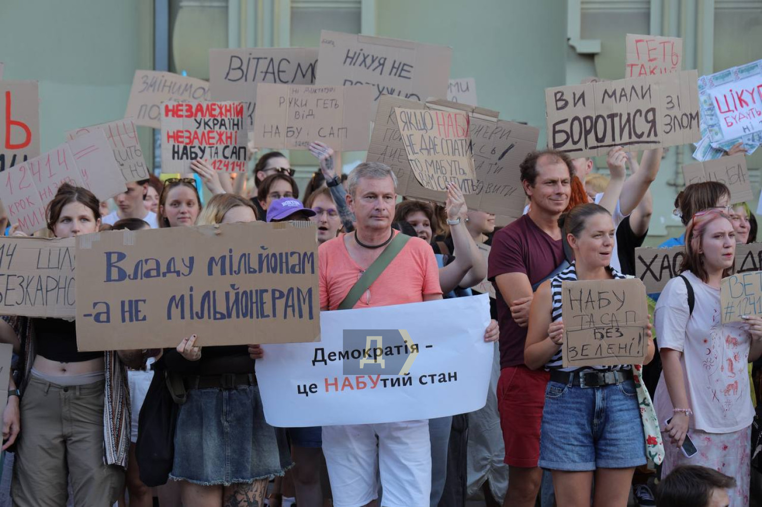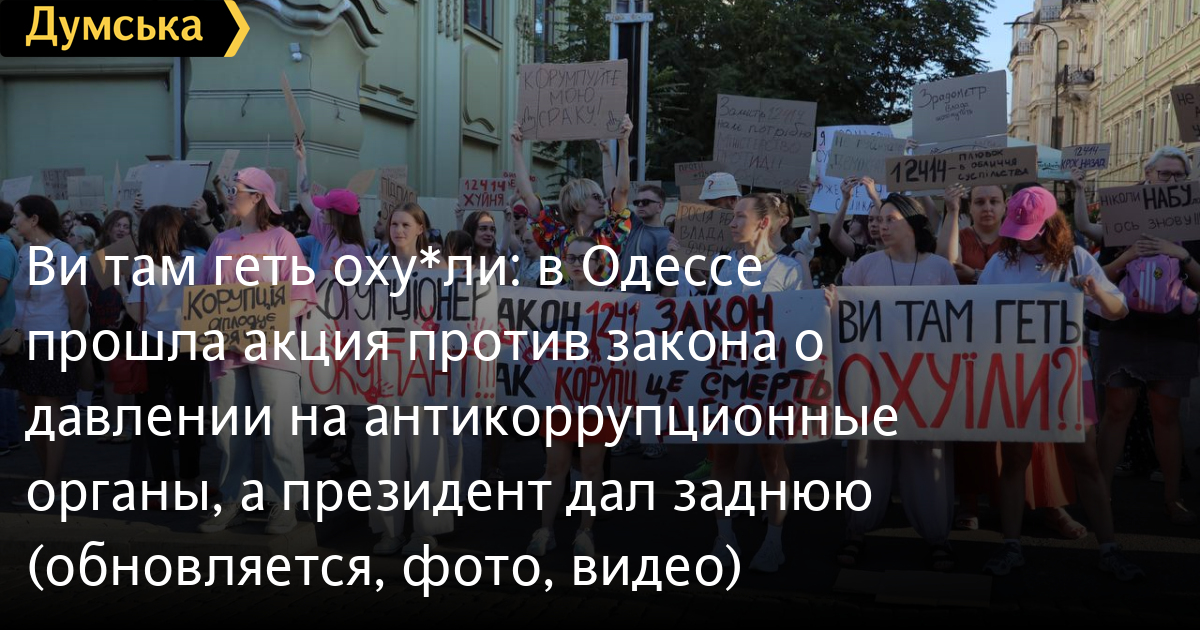 Майже тисяча одеситів вийшла на мітинг проти закону про фактичне позбавлення незалежності антикорупційних інститутів (НАБУ і САП). Як передає кореспондент «Думської», навпроти Міського саду, де зібралися переважно молоді люди, панує позитивна атмосфера. ОНОВЛЕНО О 20:30. Протестувальники рухаються в бік Біржової (раніше Думська) площі. ОНОВЛЕНО О 22:30. Мітинг тривав до пізнього вечора. Пам'ятник Пушкіну став імпровізованим постаментом для транспарантів. Мова про підписаний напередодні закон, який підпорядковує Генпрокурору (призначає глава держави) раніше незалежні від президентської вертикалі НАБУ і САП. «Мені небайдуже майбутнє моєї країни, майбутнє моїх онуків, майбутнє моїх дітей, і тому я тут. Ми скочуємося трохи не в той бік, від того, куди хотілося б, і за що ми боролися з 2014 року. І за що боремося зараз, за що воюють наші хлопці. Я говорю про свободу в своїй вільній країні», — каже учасниця акції Альона. «Не може бути успішної влади без системи стримувань і противаг. Ми не можемо змінити владу під час війни, але не повинні допустити зменшення європейської допомоги. Тому люди зібралися, щоб вимагати від президента повернути незалежність антикорупційних органів. В Україні узурпація влади не пройде. Як не пройшла вже в 2004 і 2013 роках», — пояснює свою участь в акції депутат Одеської міськради Петро Обухов. Протестувальники прийшли з саморобними транспарантами, зробленими з картонних коробок. Знайти два однакових було фактично неможливо. «Цей закон — це наступ на євроінтеграційний курс України. Нівелюються, навіть каструються основні антикорупційні органи, НАБУ і САП. Те, що їх хочуть підпорядкувати Генпрокурору — це прямий вплив центральної влади на ці органи. Ті справи, які вже в роботі «проти своїх» загальмуються, а противників влади — навпаки, прискоряться«, — розповів кореспонденту »Думської» депутат Одеської райради Сергій Сизоненко. Тим часом Зеленський, мабуть, оцінивши масштаб протестів, вже дає задню або удає. У вечірньому зверненні до нації президент пообіцяв направити до Ради новий законопроєкт, який забезпечить незалежність антикорупційних інститутів і одночасно захистить їх від російського впливу. «Ми домовилися, що керівники цих органів спільно запропонують план дій, план конкретних кроків, які можуть зміцнити силу права в Україні. Звичайно, всі чули те, що говорять люди в ці дні - в соціальних мережах, один одному, на вулицях. Це все не дарма. Проаналізували всі побоювання, всі аспекти того, що варто змінити і що має бути активізовано», — зазначив глава держави. За даними нардепа Олексія Гончаренка, який був одним з найактивніших критиків вчорашнього антиНАБУшного закону, новий законопроєкт Рада розгляне вже наступного тижня. Для цього нардепам доведеться повернутися з канікул. Оглядач «Думської» Віктор Босняк вважає, що президент відреагував не стільки на протести в Україні, скільки на те, як поставилися до його ініціатив у Європейському Союзі. «Там його бурхливо критикують, єврокомісари навіть заявили, що від незалежності антикорупційних інститутів залежить фінансова допомога Україні. Ймовірно, Зеленський розраховував, що на тлі війни його внутрішньополітичні викрутаси залишаться непоміченими за кордоном, а з опозицією він впорається, адже всі пасіонарії давно на фронті. Але, як бачимо, він і його ра