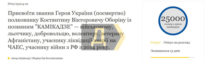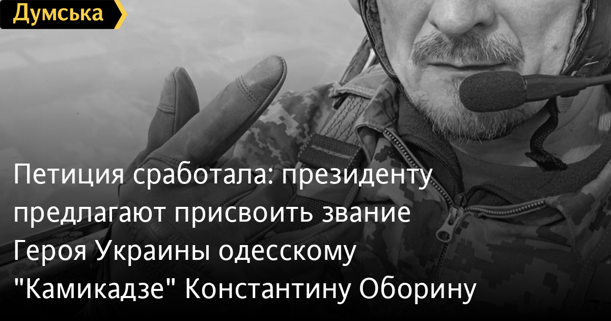 Петиція спрацювала: президенту пропонують присвоїти звання Героя України одеському «Камікадзе» Костянтину ОборінуПетиція з проханням присвоїти звання Героя України посмертно полковнику Костянтину Оборіну набрала необхідні 25 тис. голосів українців, повідомляє кореспондент «Думської». Тепер її має розглянути президент України Володимир Зеленський та публічно відповісти громадянам. Видатний одесит, військовий льотчик, ветеран кількох воєн та ліквідатор аварії на ЧАЕС загинув 18 липня 2025 року під час виконання бойового завдання, захищаючи Україну. Ініціатор петиції, донька Єва Оборіна, наголошує, що життєвий шлях полковника є прикладом незламності та жертовності, а його внесок у безпеку та славу України — неоціненний. Бойовий шлях та заслуги Костянтина Оборіна охоплюють пів століття української історії. Він ветеран Афганської війни та брав участь у ліквідації наслідків аварії на ЧАЕС у 1988 році. З перших днів повномасштабного вторгнення допомагав відбивати ворога у небі. За життя полковник Оборін отримав орден Богдана Хмельницького III ступеня. СМЕРТЬ РОСІЙСЬКИМ ОКУПАНТАМ! Помітили помилку? Виділяйте слова з помилкою та натискайте control-enter |
