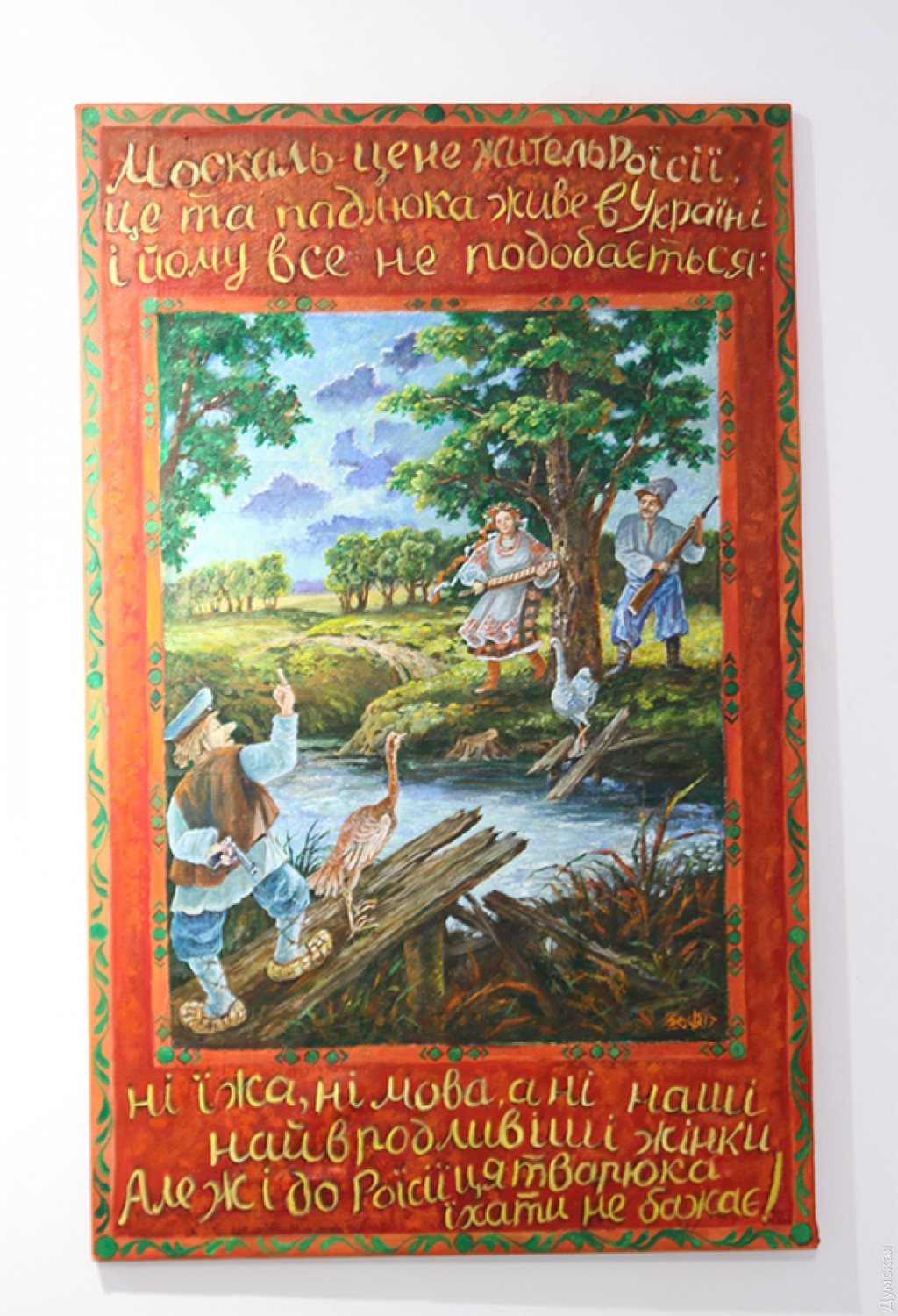 Большая часть экспонатов Пятой Одесской биеннале вполне серьезны, во многих случаях — трагичны. Но утрачивая чувство юмора, человек рискует утратить человечность. В галерее Худпромо сконцентрированы работы, в которых превалирует ироническая интонация в самых различных градациях. «Анекдоты» Олега Харча, отсылающие к наивной эстетике настенных ковриков. Но их тексты я считаю опасными. Я воспринимаю мир через картинки, и как только увидел по телевизору все эти «Хто не скаче, той москаль», понял, что до добра это не доведет».