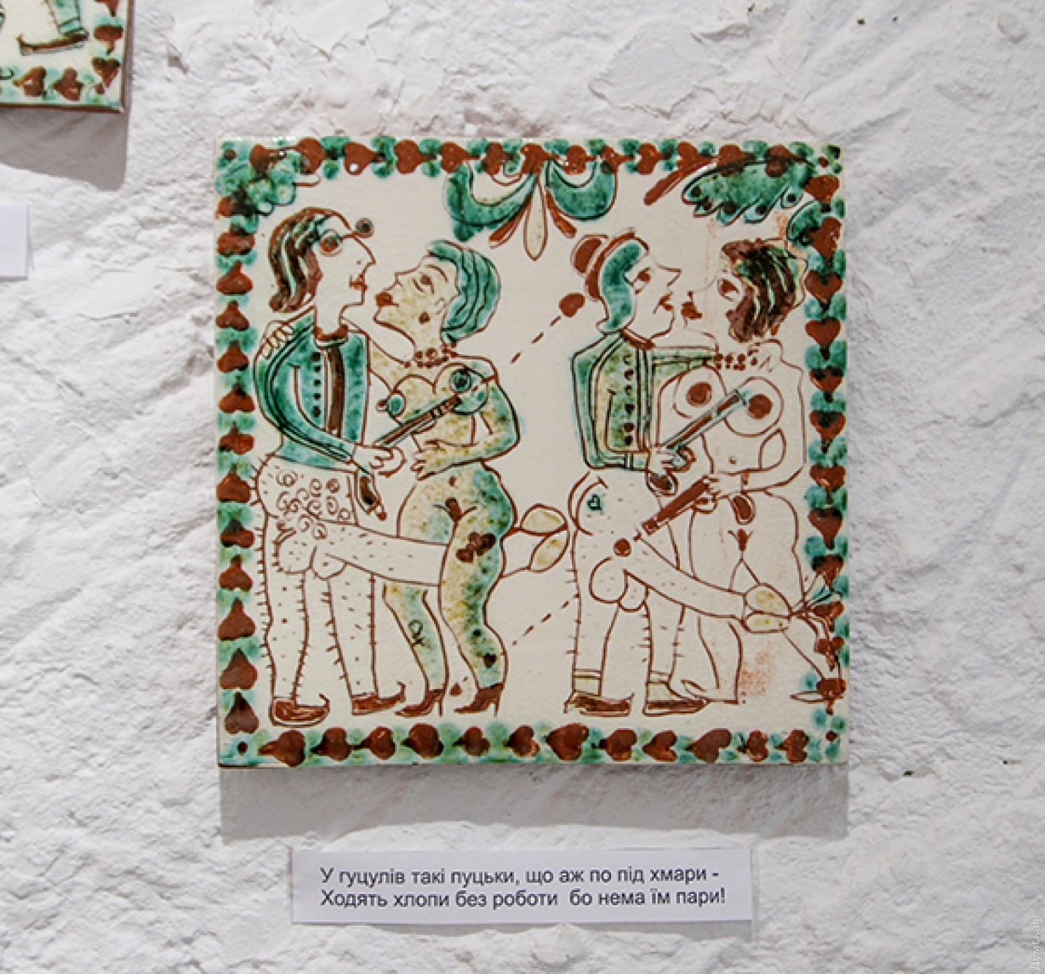 Целый пласт современного украинского искусства представили художники, выбранные куратором по такому признаку: кто ироничен – пожалуйте в галерею! Прежде всего внимательный зритель стремится к провокационной керамике Сергея Григоряна, представляющей жизнь украинской глубинки во всех анекдотичных и интимных подробностях. Текст не отстает от изображения – вот местные жительницы следят за тем, как кавалеры меряются мужскими достоинствами, а вот уже и сами попросили себе кузнеца сковать такие же. На охоте с медведем тоже что-то может получиться – карпатские охотники настолько суровые… Ярко, витально, прикольно и хорошо исполнено. Не будем пугаться нарисованного на глиняной тарелке фаллоса!