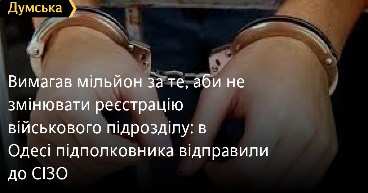 Вимагав мільйон за те, аби не змінювати реєстрацію військового підрозділу: в Одесі підполковника відправили до СІЗОНачальника відділення військової частини, якого підозрюють у вимаганні мільйона гривень, відправили до СІЗО. Підполковник вимагав гроші з голови селищної ради на Кіровоградщині за те, щоб не змінювати місце реєстрації бригад ТрО, повідомили в Київському райсуді Одеси, де підозрюваному й обрали запобіжний захід. Це дозволило б зберегти в місцевому бюджеті надходження податку на доходи фізичних осіб, який відраховується із зарплат військових. Під час одержання всієї суми неправомірної вигоди підозрюваного затримали. Таким чином, розглянувши клопотання правоохоронців, слідчий суддя частково задовольнив його. Підозрюваному обрали запобіжний захід у вигляді тримання під вартою. Розмір застави складає майже 10 мільйонів гривень. За даними «Думської», гроші військовий отримав від голови Добровеличківської селищної ради, щоб залишити за громадою підрозділи 121 і 124 бригад ТрО «Південь». Про те, як податки з військових впливають на бюджети громад і як різні ТМО витрачають отримані гроші (часом бюджет може збільшитися в десятки разів), ми пояснювали тут. СМЕРТЬ РОСІЙСЬКИМ ОКУПАНТАМ! Помітили помилку? Виділяйте слова з помилкою та натискайте control-enter Новини по цій темі: 15 липня 2025: Вимагала 400 євро за підробку документів для пенсії: в Одеській області чиновниця попалася на хабарі (фото, відео) 27 червня 2025: За 40 тис. грн хотів купити секретні розробки: в Одесі затримали співробітника приватної фірми 6 червня 2025: Вимагав три тисячі доларів за довідку про інвалідність: в Одесі затримали головлікаря лікарні (фото) 8 травня 2025: Обіцяли оформити програмістом в комунальне підприємство: в Одеській області викрили схему ухилення від армії |