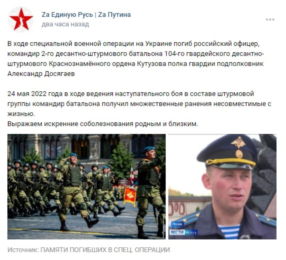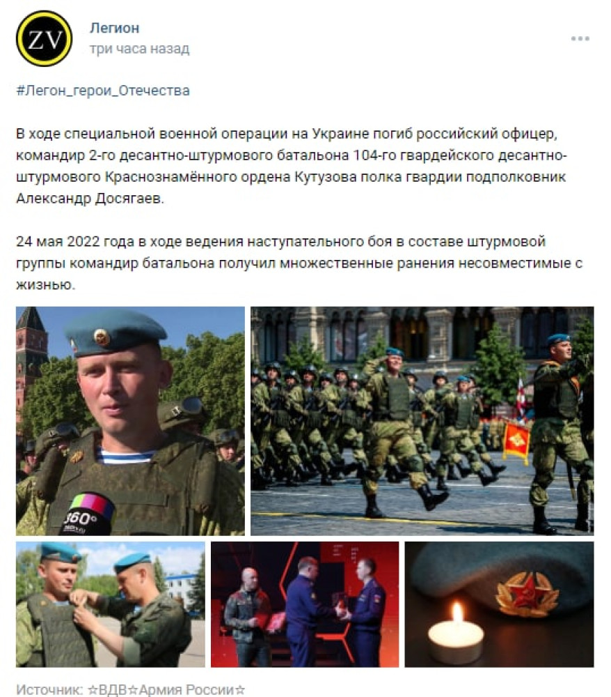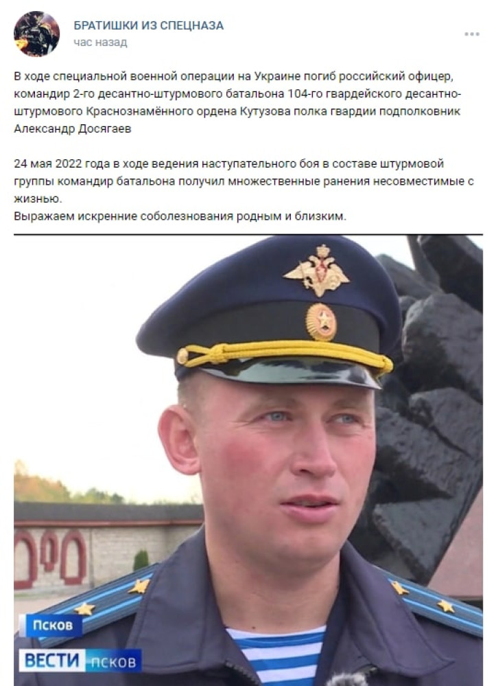 Командира десантно-штурмового батальона 104-го полка Александра Досягаева ликвидировали защитники Украины.