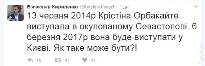 «13 июня 2014 года Кристина Орбакайте выступала в оккупированном Крыму, а 6 марта 2017 года она будет выступать в Киеве. Как такое возможно?» — написал Кириленко в «Твиттере».
