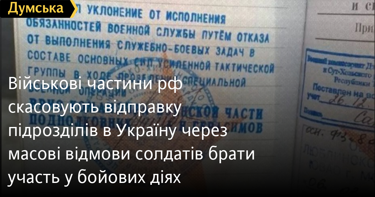В частинах і з’єднаннях, які перебувають на території рф, скасовують заплановані відправки особового складу в Україну через масову відмову від участі в бойових діях.