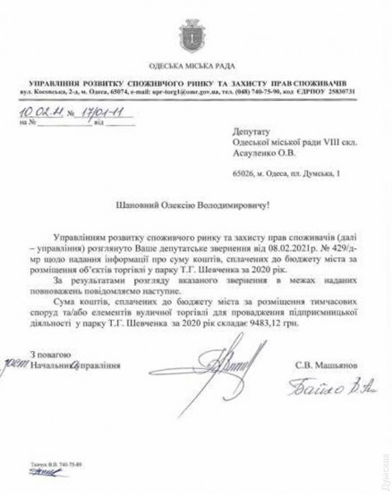 «Сколько же по факту платит луна-парк? — задается вопросом Асауленко. — Ответ уже озвучен – 31 тысячу гривен в месяц за 3156 кв. метров «аренды асфальта» — это 10 грн за квадратный метр. Всем понятно, что арендовать асфальтное покрытие гораздо выгоднее, чем заключать договор с управлением торговли! И еще, не забывайте, что минимальная ставка за размещение элементов торговли составляет 105 грн за 1 кв. м».