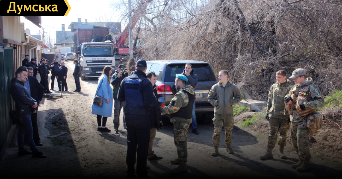 На помощь владельцам строений также прибыли представители общественной организации «Україна — це ми». Глава организации Виталий Голодок заявил собравшимся, что землю хотят захватить нечистые на руку чиновники и силовики — якобы для строительства личных коттеджей. А территорию, где стоял вагончик, он назвал берегоукреплением.
