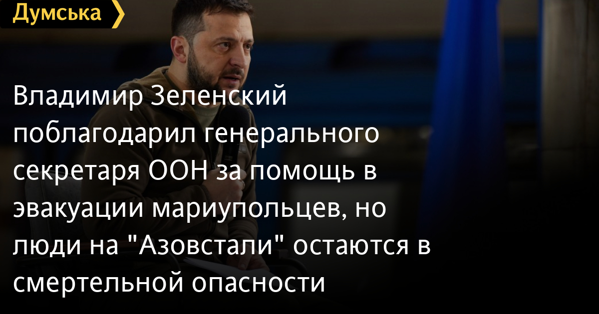 Владимир Зеленский проинформировал Антониу Гутерриша об успешном проведении первого этапа, во время которого из «Азовстали» удалось вывезти 121 человека, и выразил надежду на успешное продолжение эвакуационной операции.