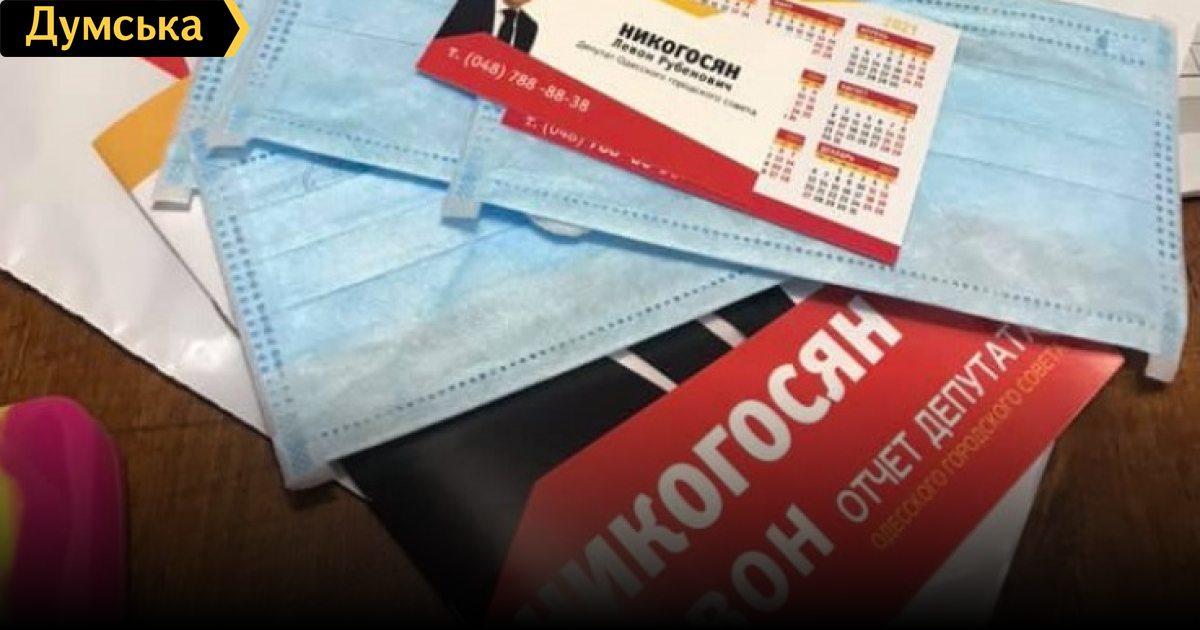 Вместо гречки: директор коммунальных аптек Одессы подкупает избирателей масками, которые продавал по завышенной ценеОригинально начал свою избирательную кампанию директор КП «Одесфарм» и депутат горсовета от трухановской партии «Доверяй делам» Левон Никогосян. Он решил завоевывать сердца избирателей, раздавая им медицинские маски. Напомним, в самом начале эпидемии COVID-19 аптеки «Одесфарм», пользуясь ажиотажным спросом, продавали эти средства индивидуальной защиты по цене, которая в 25 раз превышала докарантинную. «Коммунальные» маски были дороже, чем те, что реализовывали частные аптеки. Избирательный кодекс запрещает проведение предвыборной агитации путем «предоставления избирателям, учреждениям, организациями, независимо от их подчинения и формы собственности, денег, подарочных сертификатов, продуктов питания и спиртных напитков, товаров льгот, преимуществ, работ, ценных бумаг, кредитов, лотерейных билетов, других материальных и нематериальных активов». Фото Дмитрия Шпинарева СМЕРТЬ РОСІЙСЬКИМ ОКУПАНТАМ! Помітили помилку? Виділяйте слова з помилкою та натискайте control-enter