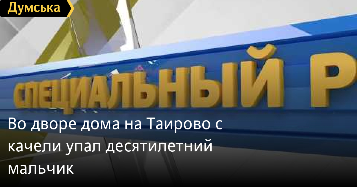 Полицейские проверят техническое состояние качели на Таирово. Накануне с нее на детской площадке упал десятилетний мальчик. Травма оказалась смертельной. Кто виноват в трагедии ребенка, СМЕРТЬ РОССИЙСКИМ ОККУПАНТАМ! Заметили ошибку? Выделяйте слова с ошибкой и нажимайте control-enter Думская ТВ. Сюжеты: