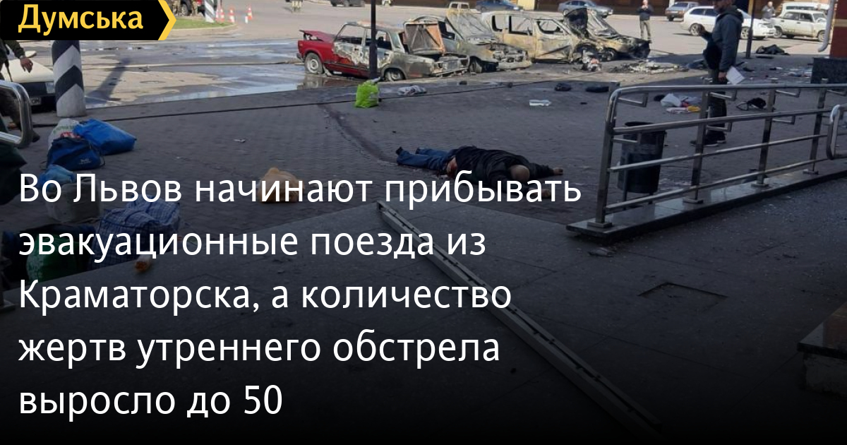 Количество жертв утреннего удара российских оккупационных войск «Точкой-У» по железнодорожному вокзалу Краматорска выросло до 50 человек. Среди погибших — пятеро детей.