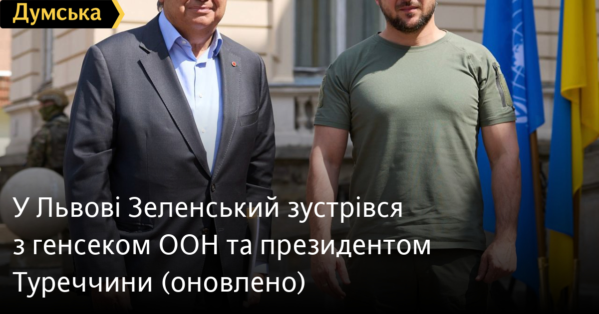 Президент України, верховний головнокомандувач Володимир Зеленський у Львові провів зустрічі з генеральним секретарем ООН Антоніо Гутеррішем та президентом Туреччини Реджепом Ердоганом.