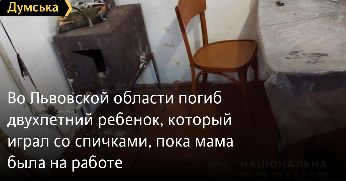 Во Львовской области погиб двухлетний ребенок, который играл со спичками, пока мама была на работеВ городе Жидачов Львовской области погиб двухлетний мальчик, который остался со старшим братом и сестрой без присмотра матери. Об этом сообщила пресс-служба полиции Львовской области. Полицейские получили информацию о происшествии 8 декабря. Оказалось, что мальчик вместе с четырехлетней сестрой и шестилетним братом остались одни дома, потому что их мама была на работе. Ребенок, которому было 2 года и 8 месяцев, играл со спичками и в какой-то момент на нем загорелась одежда. Около девяти утра сегодня в дом пришла тетя детей, которая вызвала медиков и сообщила о происшествии в полицию. Как установили врачи, мальчик получил термические ожоги и отравился продуктами горения. Спасти жизнь ребенка медикам не удалось. По данному факту следователи открыли уголовное производство по ст.166 (злостное невыполнение обязанностей по уходу за ребенком или за лицом, в отношении которого установлена опека или попечительство) УК Украины. Санкция статьи предусматривает ограничение свободы на срок от двух до пяти лет или лишение свободы на тот же срок. Двух других детей, которые были в доме, доставили в больницу для медосмотра — угрозы их жизни нет. СМЕРТЬ РОССИЙСКИМ ОККУПАНТАМ! Заметили ошибку? Выделяйте слова с ошибкой и нажимайте control-enter |