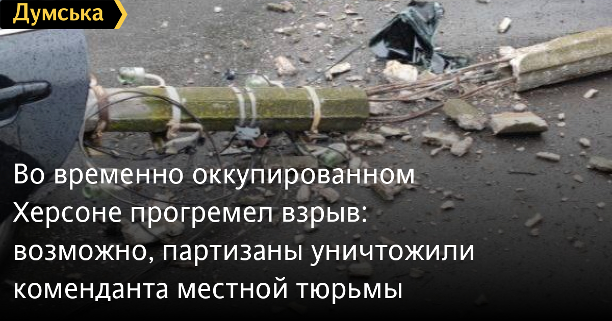 В тимчасово окупованому Херсоні пролунав вибух: можливо, партизани знищили коменданта місцевої тюрмиГучний вибух пролунав сьогодні в тимчасово окупованому Херсоні. Як повідомляє окупаційна влада, загинула одна людина і ще троє дістали поранення. Так званий «міністр охорони здоров'я Херсонської області» Вадим Ільмієв заявив, що «внаслідок теракту на вулиці Чорноморській у Херсоні загинув чоловік 1972 року народження і троє людей поранені». За попередніми даними «екстрених служб», в автомобілі або поруч із ним спрацював саморобний вибуховий пристрій. Херсонське видання «Мост» із посиланням на російські ЗМІ повідомляє, що вибух у Херсоні – результат замаху на колаборанта, «начальника місцевого СІЗО» Олега Тютюрая. Судячи з усього, вибухівка була у стовпі: на фото видно бетонний стовп з арматурою, розламаний навпіл потужною вибуховою силою. Про стан здоров'я Тютюрая поки що невідомо. СМЕРТЬ РОСІЙСЬКИМ ОКУПАНТАМ! Помітили помилку? Виділяйте слова з помилкою та натискайте control-enter |