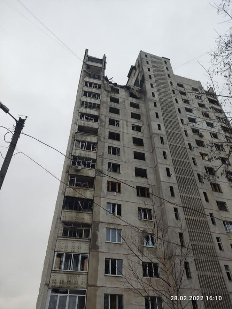 «28 февраля во время обстрелов подверглись разрушениям верхние этажи 2 жилых 16-этажных домов на ул. Кольцевой. Из двух домов были эвакуированы 35 человек. 8 человек были травмированы», — отметили спасатели.