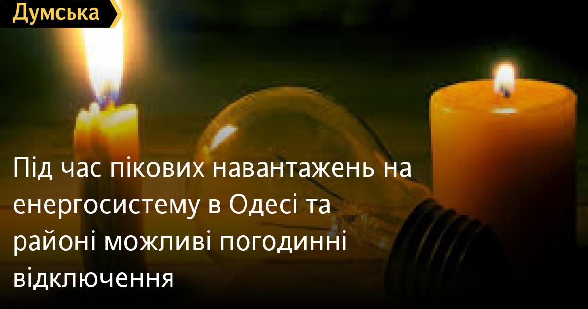 Під час пікових навантажень на енергосистему в Одесі та районі можливі погодинні відключенняГодинні нетривалі відключення світла можливі в Одесі та районі під час пікових навантажень на енергосистему. Про це повідомив керівник обласної військової адміністрації Максим Марченко. «Під час пікових навантажень на енергосистему в Одеському районі та Одесі будуть відбуватися нетривалі погодинні відключення. Але енергетики досить оперативно проводять ремонтні роботи, щоб вирішити цю проблему», — заявив Марченко. СМЕРТЬ РОСІЙСЬКИМ ОКУПАНТАМ! Помітили помилку? Виділяйте слова з помилкою та натискайте control-enter |