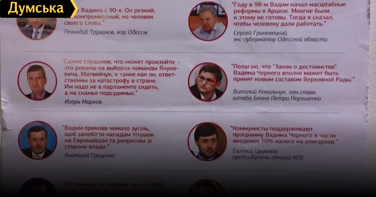 Во время запрета агитации в Одессе распространяют листовки в пользу одного из кандидатовВ «день тишины» в Киевском районе Одессы начали распространять листовки в пользу кандидата Вадима Черного. В агитке собраны цитаты известных политиков, которые якобы призывают голосовать за Черного. Однако искушенный избиратель сразу заметит ряд ляпов. Так, начальник штаба Блока Петра Порошенко Виталий Ковальчук, естественно, никогда не высказывался в пользу Черного, тем более что в Киевском районе Одессы есть кандидат от БПП - Дмитрий Спивак. Кроме того, упомянутый в листовке экс-кандидат Вячеслав Крук заявил, что не снимал свою кандидатуру в пользу Черного и никоим образом не поддерживает его. К слову, ранее в Одессе появились рекламные щиты с агитацией в пользу Черного, стиль которых напоминал символику Блока Петра Порошенко. В «день тишины» их тоже не сняли. В штабах оппонентов Черного расценивают эти факты как попытку запутать избирателей. СМЕРТЬ РОСІЙСЬКИМ ОКУПАНТАМ! Помітили помилку? Виділяйте слова з помилкою та натискайте control-enter