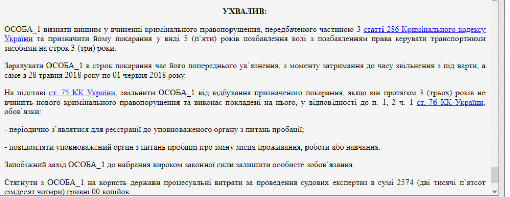 Такое решение вынес Кодымский районный суд, который признал водителя виновным по ч.3 ст.286 УК Украины (нарушение безопасности дорожного движения, что повлекли гибель нескольких человек) и назначил наказание в виде лишения свободы сроком на пять лет и лишил права управления транспортными средствами сроком на три года.