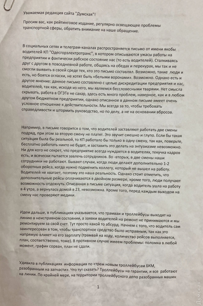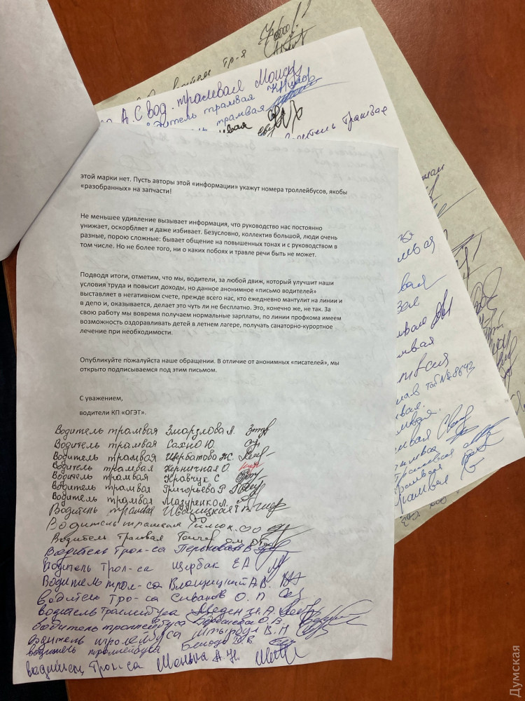 В редакции «Думской» побывала целая делегация от всех трех депо коммунального предприятия «Одесгорэлектротранс», которые попросили опубликовать коллективный ответ на анонимку, появившуюся в сети после недавнего наезда трамвая на пожилую одесситку.