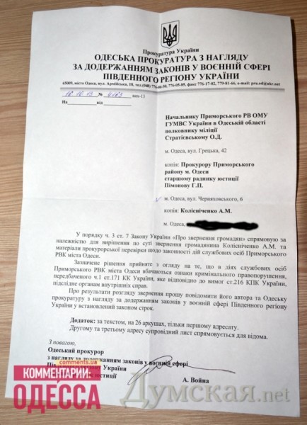 При этом, согласно ст.216 УПК, дело передано в Приморскую районную прокуратуру города Одессы и Приморский райотдел милиции.