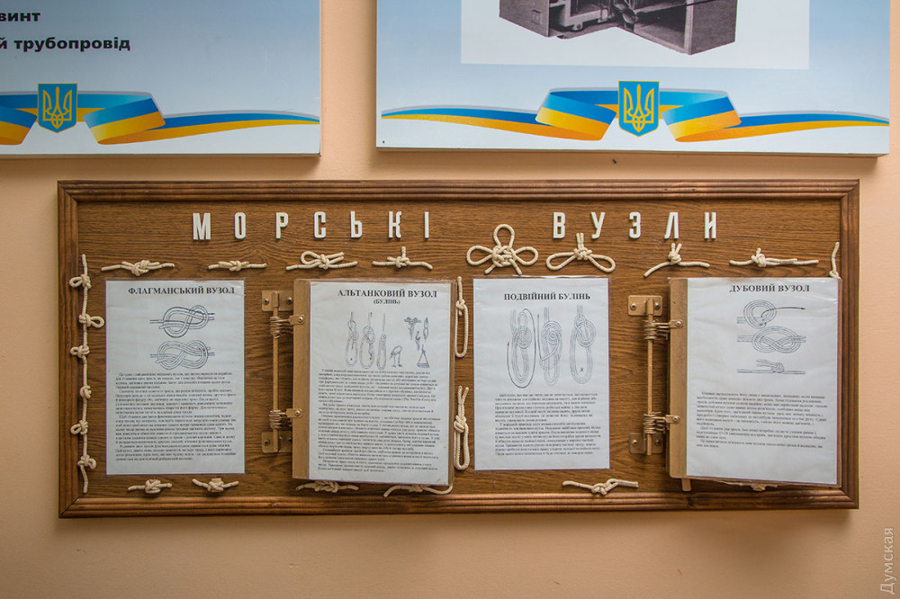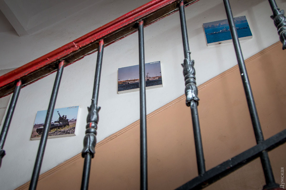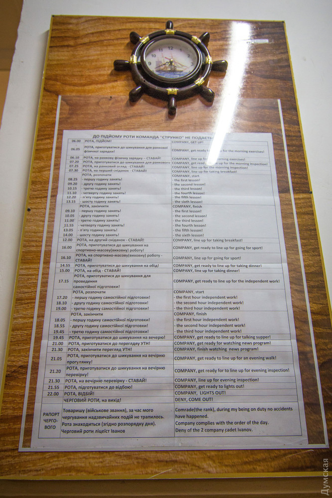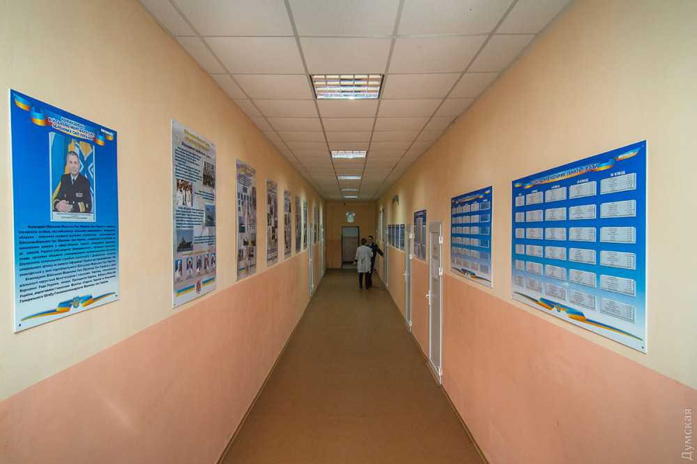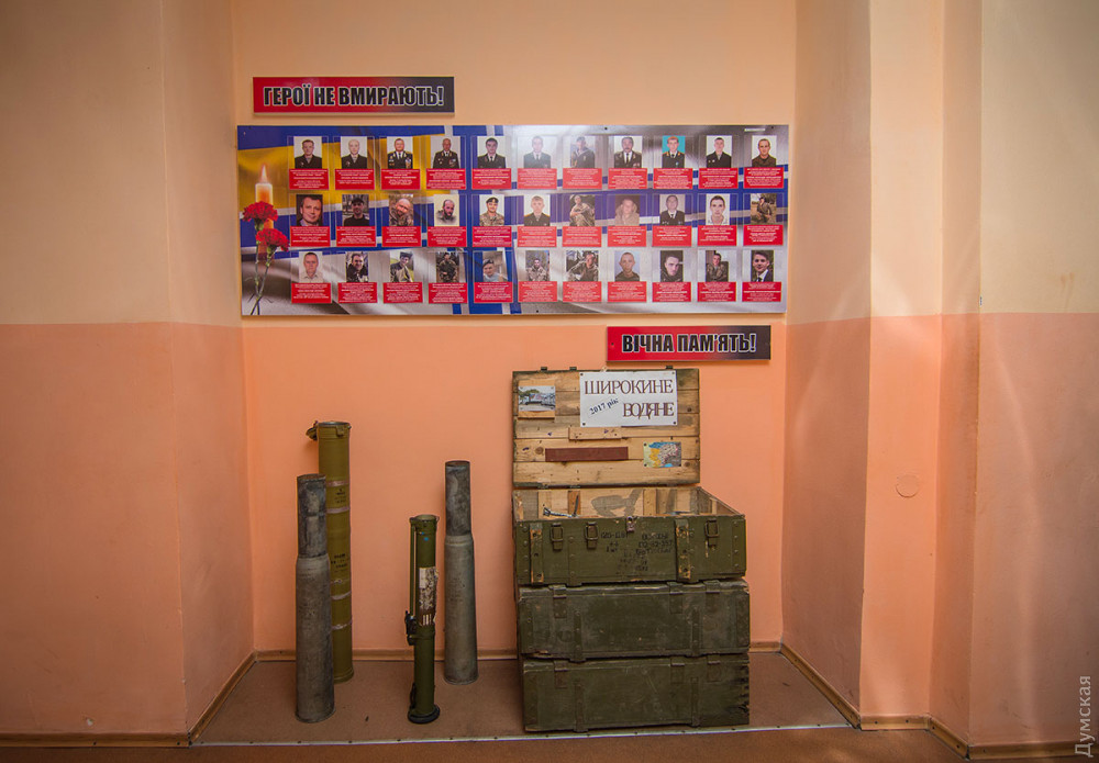 Вообще, военно-морской статус учреждения здесь ощущается на каждом шагу, начиная от рынды возле входа и подтянутых дневальных на воротах. В лицейском коридоре — импровизированная выставка «Герої не вмирають»: портреты погибших моряков и «сувениры» с фронта — снаряды, осколки, гильзы российского производства, которые лицеистам привезли из Водяного, Широкино и других мест, где воюют украинские моряки и морские пехотинцы.