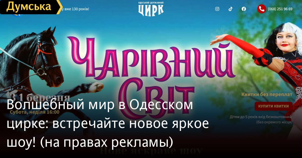 Волшебный мир в Одесском цирке: встречайте новое яркое шоу! (на правах рекламы)С 1 марта по 5 апреля Одесский государственный цирк приглашает зрителей окунуться в атмосферу настоящей магии и чуда. Программа собрала лучшие жанры циркового искусства, которые заставят сердце биться быстрее, а на лице — появиться улыбке. Под куполом — блестящие воздушные гимнасты! На манеже — искусные жонглеры и эквилибристы, а также множество замечательных животных! Билеты без переплат на сайте цирка circus.od.ua. СМЕРТЬ РОССИЙСКИМ ОККУПАНТАМ! Заметили ошибку? Выделяйте слова с ошибкой и нажимайте control-enter |