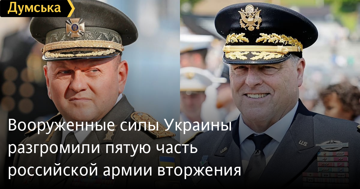Вооруженные силы Украины разгромили пятую часть российской армии вторженияВооруженные силы Украины разгромили пятую часть подразделений российских войск, вовлеченных в войну. Об этом сообщил главнокомандующий Вооруженными силами Украины Валерий Залужный по итогам разговора с председателем объединенного комитета начальников штабов США Марком Милли. «Во время сегодняшнего телефонного разговора в очередной раз сверили оценки потерь россиян в этой войне. Мы отмечаем, что противник несет значительные потери, прежде всего в живой силе – пятая часть подразделений вс рф, вовлеченных в боевые действия в Украине, разгромлена», — отметил он. Залужный также проинформировал Милли о том, что активные боевые действия сегодня продолжаются на 1300 км фронта. «Мы очень нуждаемся в усилении артиллерийского огня – я снова обратился с этим к нашим партнерам», – отметил главнокомандующий Вооруженными силами. СМЕРТЬ РОССИЙСКИМ ОККУПАНТАМ! Заметили ошибку? Выделяйте слова с ошибкой и нажимайте control-enter |