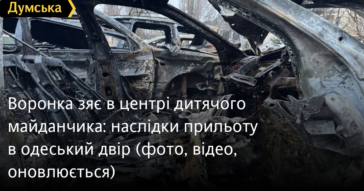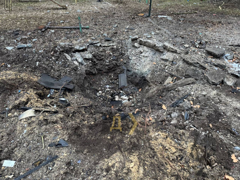 Як повідомляє кореспондент «Думської» з місця подій, вирва зяє в центрі дитячого майданчика на подвір'ї, який постраждав від атаки безпілотників. У навколишніх будинках вибиті вікна.