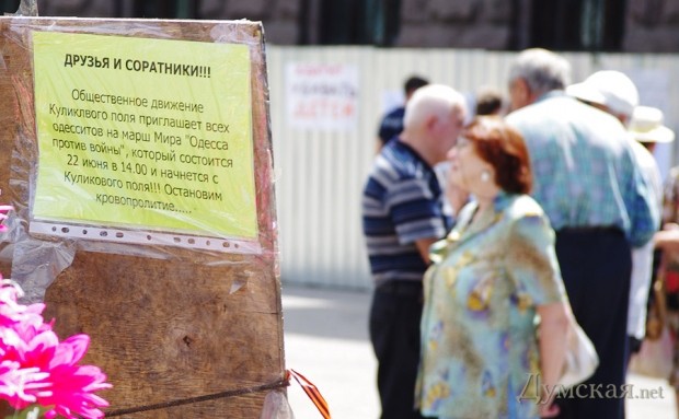 Традиционная воскресная встреча, проводимая пророссийски настроенными одесситами, сегодня не задалась. Несмотря на многократный анонс, никаких масштабных событий в связи с годовщиной начала Великой Отечественной войны на Куликовом поле 22 июня не происходило — ни в два часа дня, ни в шесть вечера.